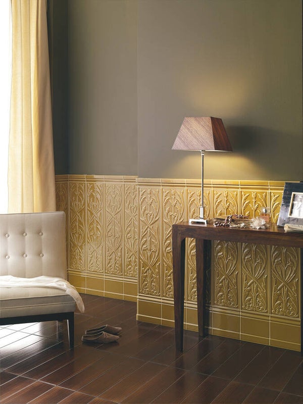 Lambrizering epoque in de kleur caramel bestaande uit drie onderdelen: plinttegel, paneeltegel en eindtegel bovenaan. Prijs zoals hier getoond is Euro 495,00 per strekkende meter. Levertijd minimaal 4 weken.