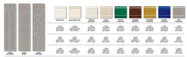 Lambrizering epoque in de kleur grijs bestaande uit drie onderdelen: plinttegel, paneeltegel en eindtegel bovenaan. Prijs zoals hier getoond is Euro 495,00 per strekkende meter. Levertijd minimaal 4 weken.