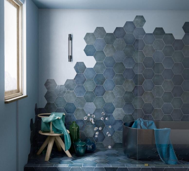 Serie hexagon tegels voor vloer en wand in formaat 17,5x20 cm. De kleurnuances geven een heel mooi effect. De tegel is van porselein, slijtvast en gemakkelijk in onderhoud. Prijs is per m2. De levertijd is ca 3 weken.