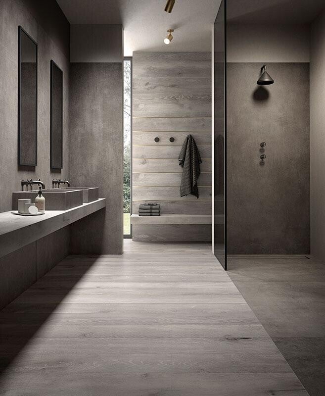 Badkamer op de foto is opgebouwd uit de volgende tegels: uit de serie Les Bois van Kronos de kleur Sarawa in de uitvoering naturale in het formaat 20x120 cm. De prijs is per m2. De levertijd is 4 weken.