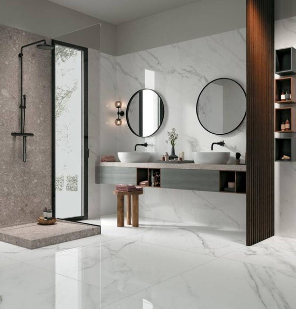 Serie porseleinen glanzende tegels geïnspireerd door de mooiste marmersoorten. De tegels zijn er in diverse formaten, ook in grote slabs voor de wand. Wilt u daar iets van weten stuur ons dan een bericht. Let op met gepolijste tegels voor de vloer: ook al zijn ze kwalitatief nog zo hard, er kunnen in de loop van de tijd krasjes op komen. Prijs is per m2. Levertijd 4 weken. Minimale afname 25 m2.