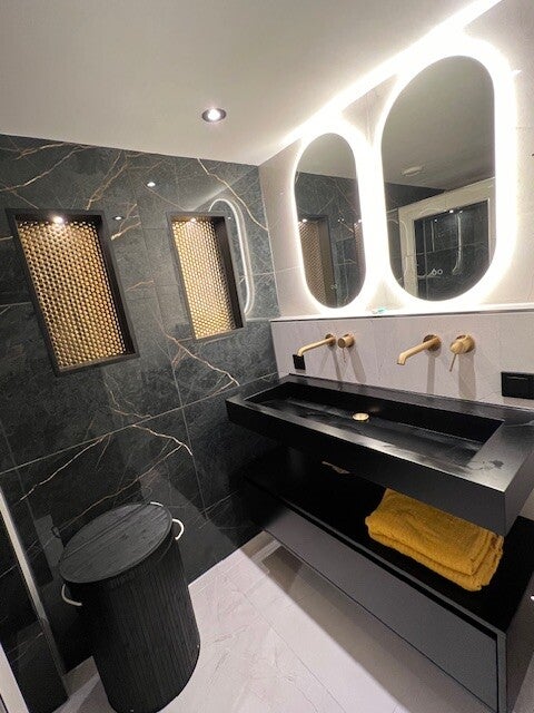 Aangezien ik van de tegels ben kan ik zeggen dat de Flaviker tegels niet teleur stellen. De zwarte glans Evo Noir Laurent 60x120 cm op de achterwand, de ivoorkleurige Supreme Memories 60x120 cm in glans op de wanden en in mat op de vloer. In de nissen een rustige goudkleurige mozaiek op vel.