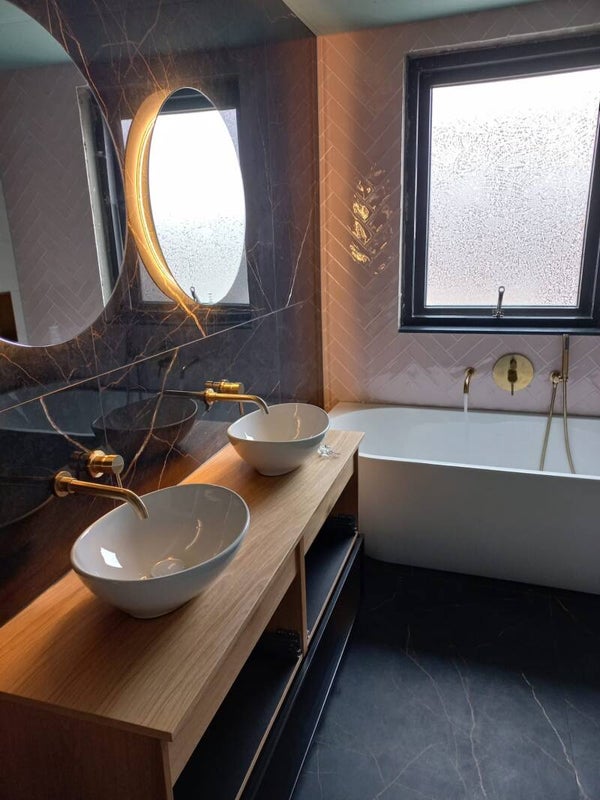 Groot formaat klassieke marmerlook in wit (Marazzi) en zwart (Flaviker). Een mooie visgraat wand in roze (Harmony Blush) geeft het geheel een luchtig accent. De marmerlooks zijn 120x120 cm. De prijs is per m2. En de levertijd is meestal een week.