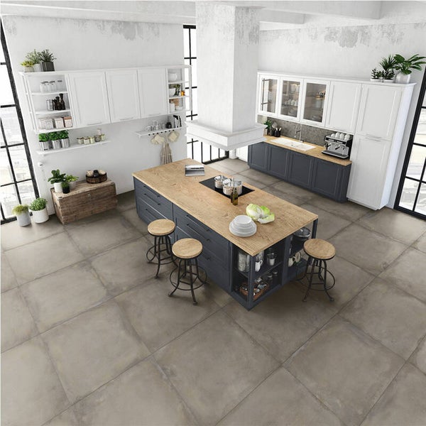 Betonlook porseleinen vloertegel in een vijftal kleuren en 3 formaten: 90x90 cm, 61x61 cm en 31x61 cm. Slijtvast en gemakkelijk in onderhoud. Levertijd 61x61 cm en 31x61 cm een week.