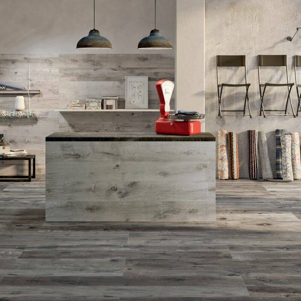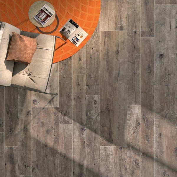 Mooie plankenvloer met knoesten in de slijtvaste keramische vloertegelserie Dakota. De serie heeft vier natuurlijke kleuren en wel vijf formaten die gecombineerd kunnen worden. De tegel is ook mooi om een wandje mee te bekleden. De prijs is per m2. De levertijd is vanaf een week tot enkele weken.