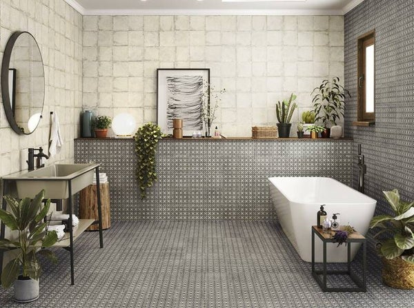 Patroontegel serie van porselein in rustig en natuurlijk kleurenpalet.  Formaat 20x20 cm. Mooie patronen en bijpassende unikleuren. Tegels zijn slijtvast. Prijs is per m2. Levertijd is ca 3 weken.