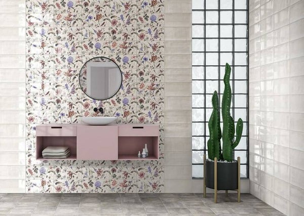Wandtegelserie Acquarel in een viertal kleuren met bijpassende decortegels in formaat 15x30 cm. Voor de liefhebbers van een levendige wand is dit zeker een aanrader.