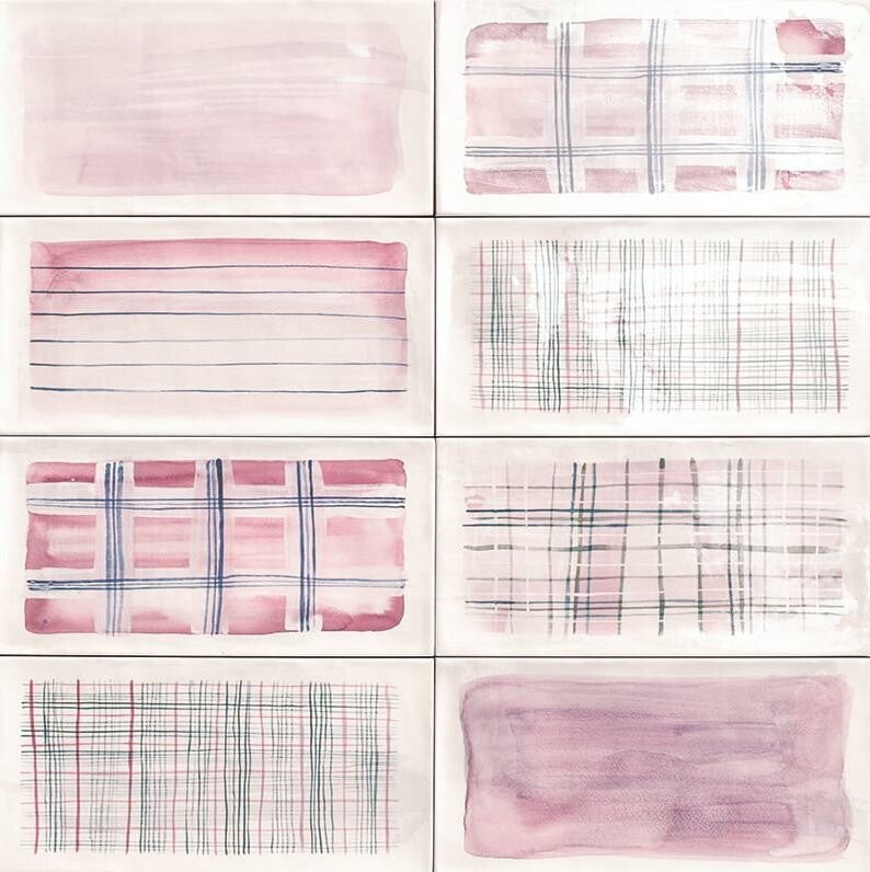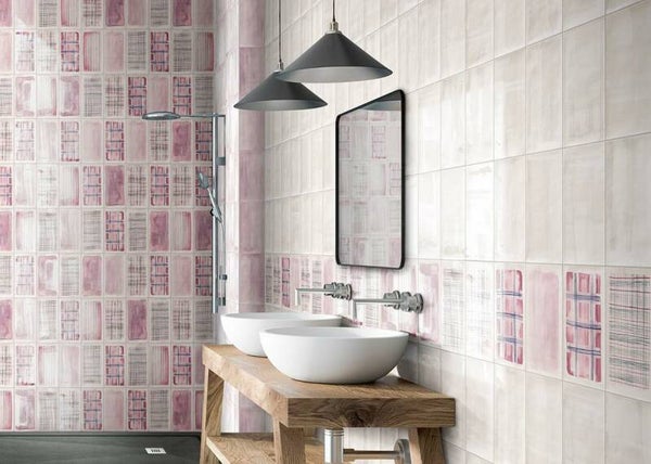 Wandtegelserie Acquarel in een viertal kleuren met bijpassende decortegels in formaat 15x30 cm. Voor de liefhebbers van een levendige wand is dit zeker een aanrader.