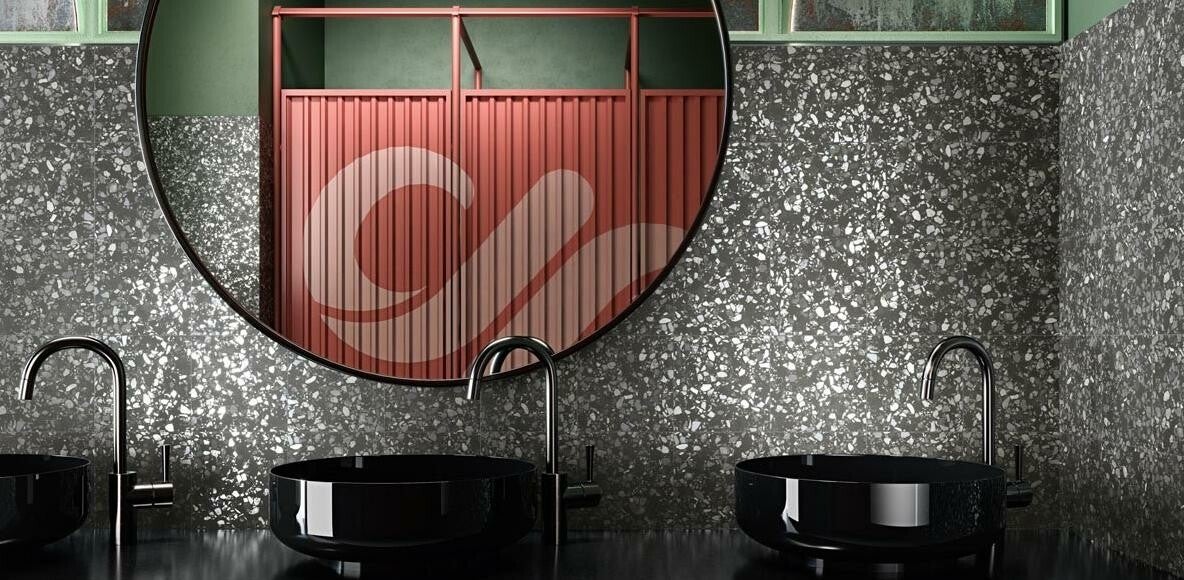 Terrazzo tegel die op de vloer en de wand toegepast kan worden met donkere tinten. Dikte is 8 mm. De tegel is keramisch, dus gemakkelijk in onderhoud. Prijs is per m2 en levertijd is enkele weken.