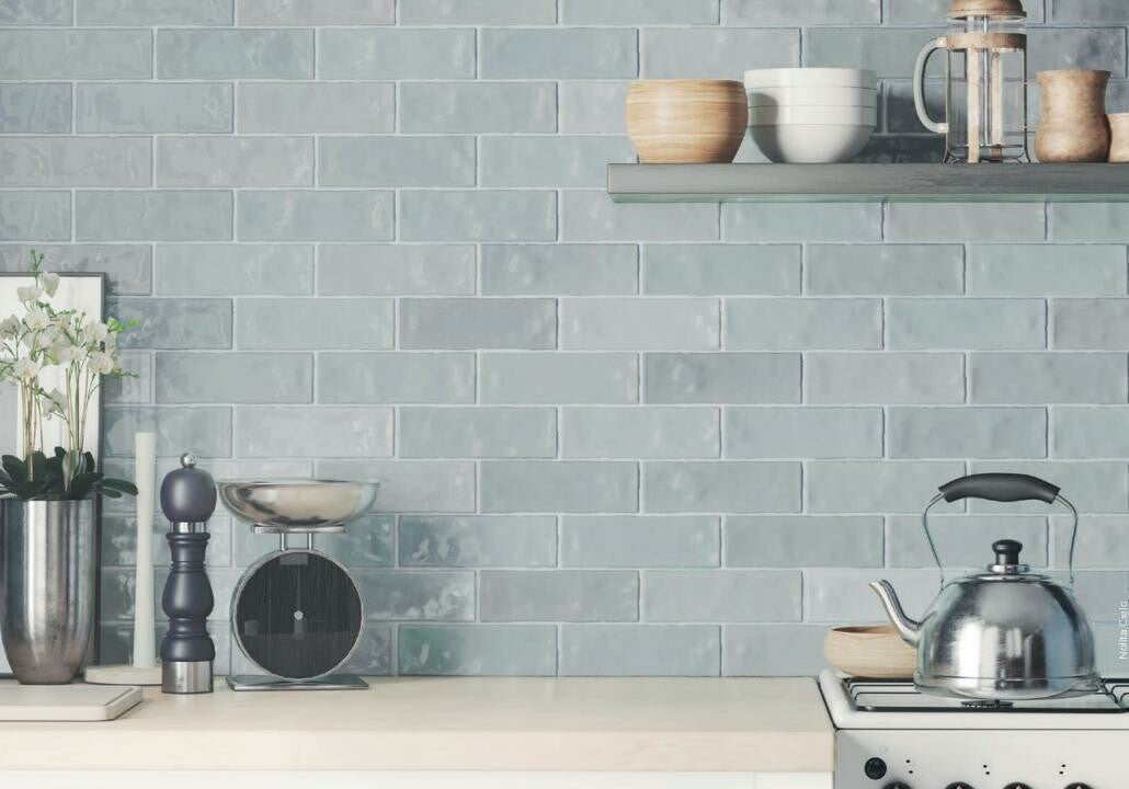 Handvorm wandtegel met subtiele kleurvariatie in het glazuur. Formaat 6,5x20 cm. De tegels zijn geschikt voor badkamers, keukens en lambrizeringen. Ze kunnen op verschillende manieren geplaatst worden, zie afbeelding hiervoor. Levertijd is een week. Prijs is per m2.
