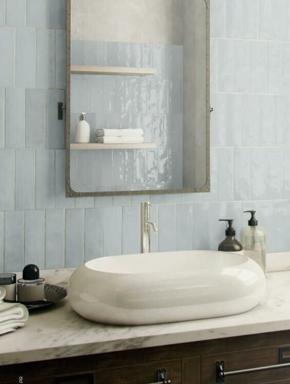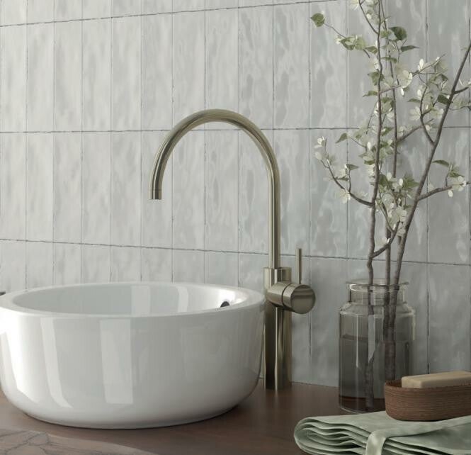 Handvorm wandtegel met subtiele kleurvariatie in het glazuur. Formaat 6,5x20 cm. De tegels zijn geschikt voor badkamers, keukens en lambrizeringen. Ze kunnen op verschillende manieren geplaatst worden, zie afbeelding hiervoor. Levertijd is een week. Prijs is per m2.