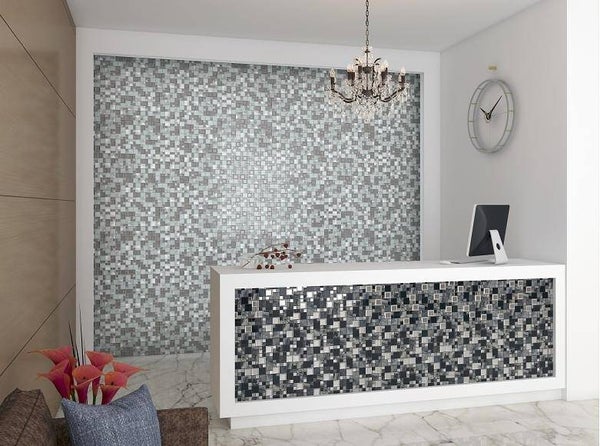 Mozaiek van gemengde materialen, geschikt voor de wand. Glad oppervlak. Reinigen met zuurvrije schoonmaakmiddelen. Prijs is per matje. Levertijd 1 tot 2 weken.