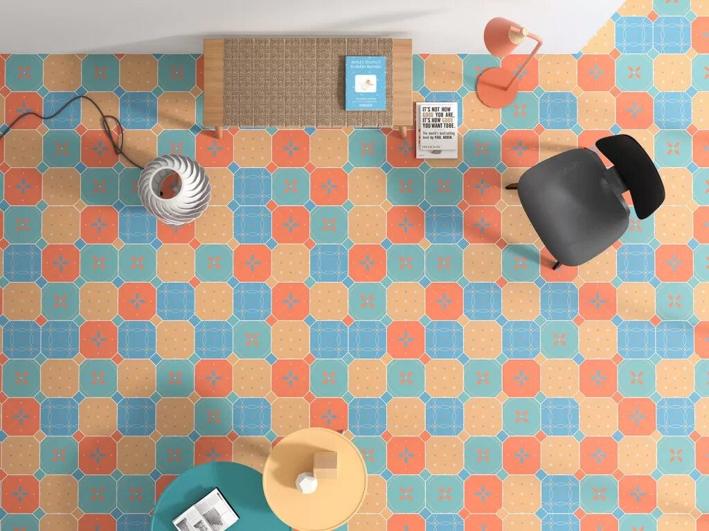 Vrolijke serie vloertegels octagon formaat die met een bijpassend blokje (taco) gelegd moeten worden. De tegels en de taco's kunnen naar wens gemixt worden. Het formaat van de octagons is 20x20 cm. Het formaat van de taco's is 4,6x4,6 cm. Om de vloer compleet te maken heb je voor elke octagon tegel 1 taco nodig. Dus voor 1 m2 octagons heb je 25 stuks taco's nodig. Vragen? Mail ons.