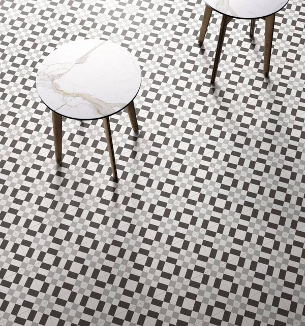 Patroontegels in zwart/wit en grijstinten. Ook weer met een knipoog naar het verleden toen de motieven of bloemrijk of geometrisch waren. Deze serie heeft een sterk grafisch patroon. Er zijn unikleuren beschikbaar om aan te vullen of te combineren. Prijs is per m2. Levertijd is ca. 4 weken.