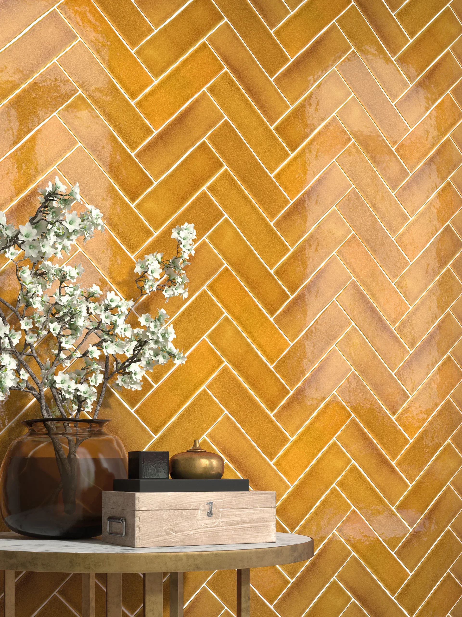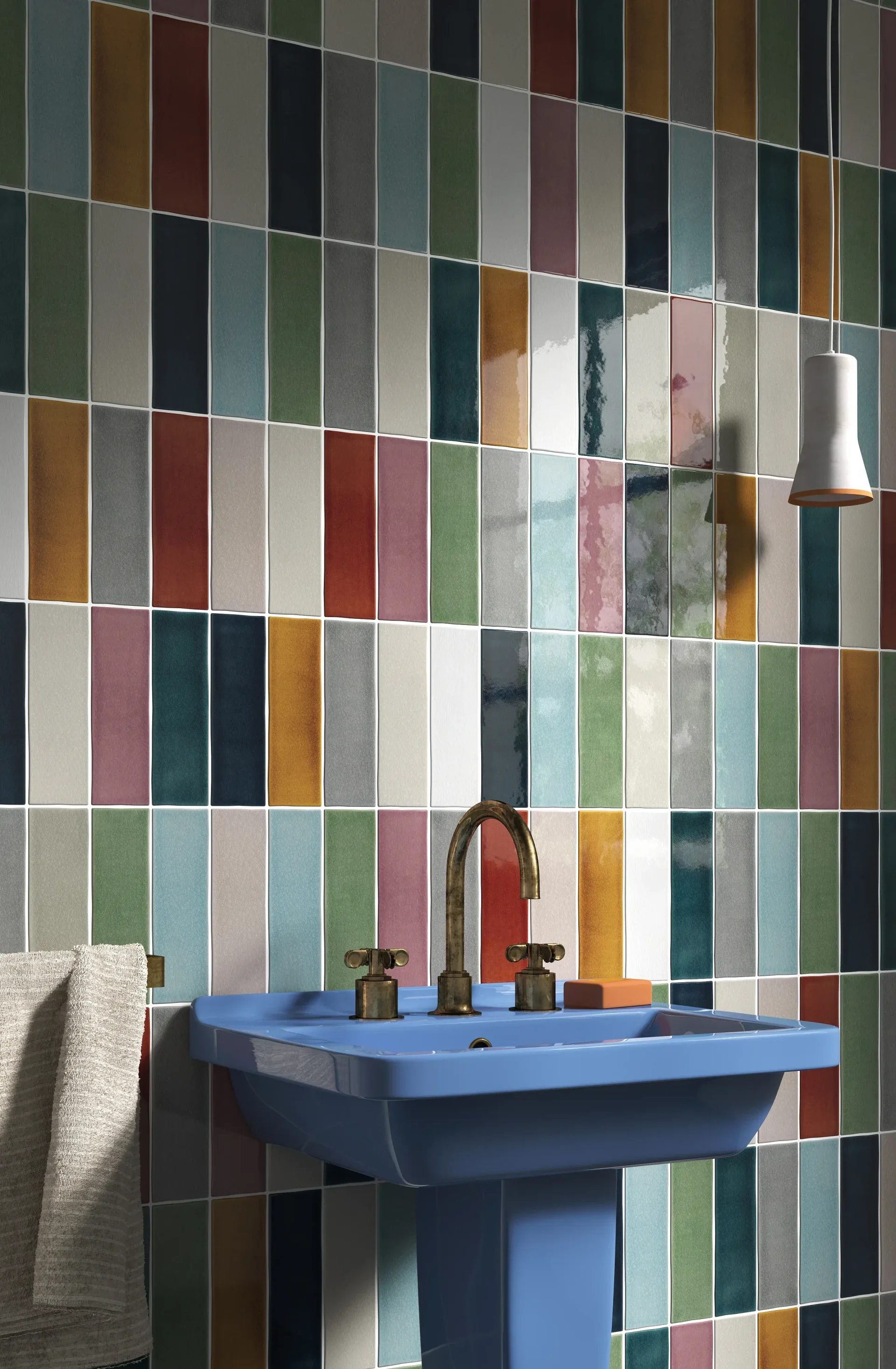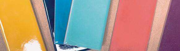 Wandtegels in diverse kleine rechthoekige formaten.
